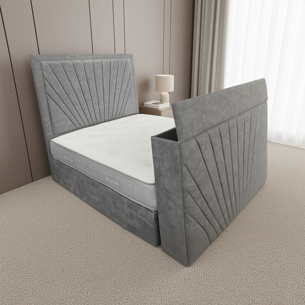 The centerpiece is the stunning fan-tufted headboard, featuring dramatic radiating panels that create a focal point of elegance. Hidden within the slimline footboard is a smooth, quiet electric TV lift mechanism, allowing you to stow your screen away when not in use and pop it up at the touch of a button.