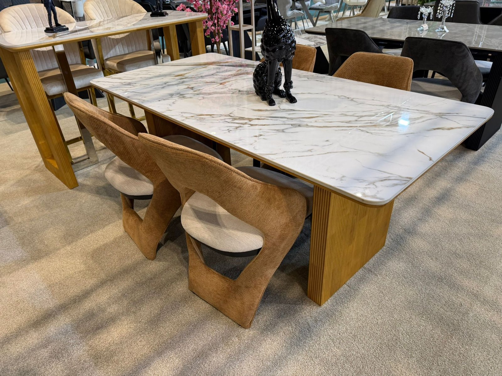 Milan Gold Fluted White Marble Dining Table Set – with 4 Tan Sculptural Chairs